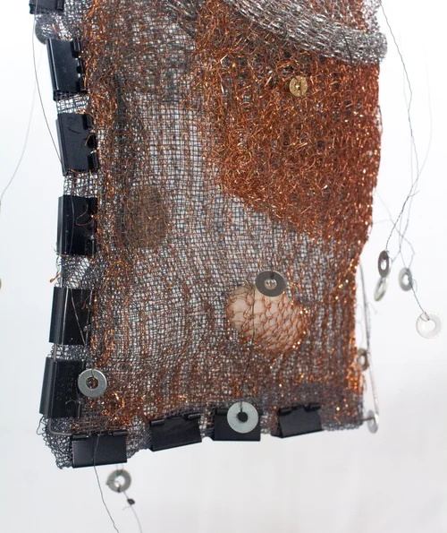 piano wire, copper mesh, aluminum mesh, washers, clips, glass